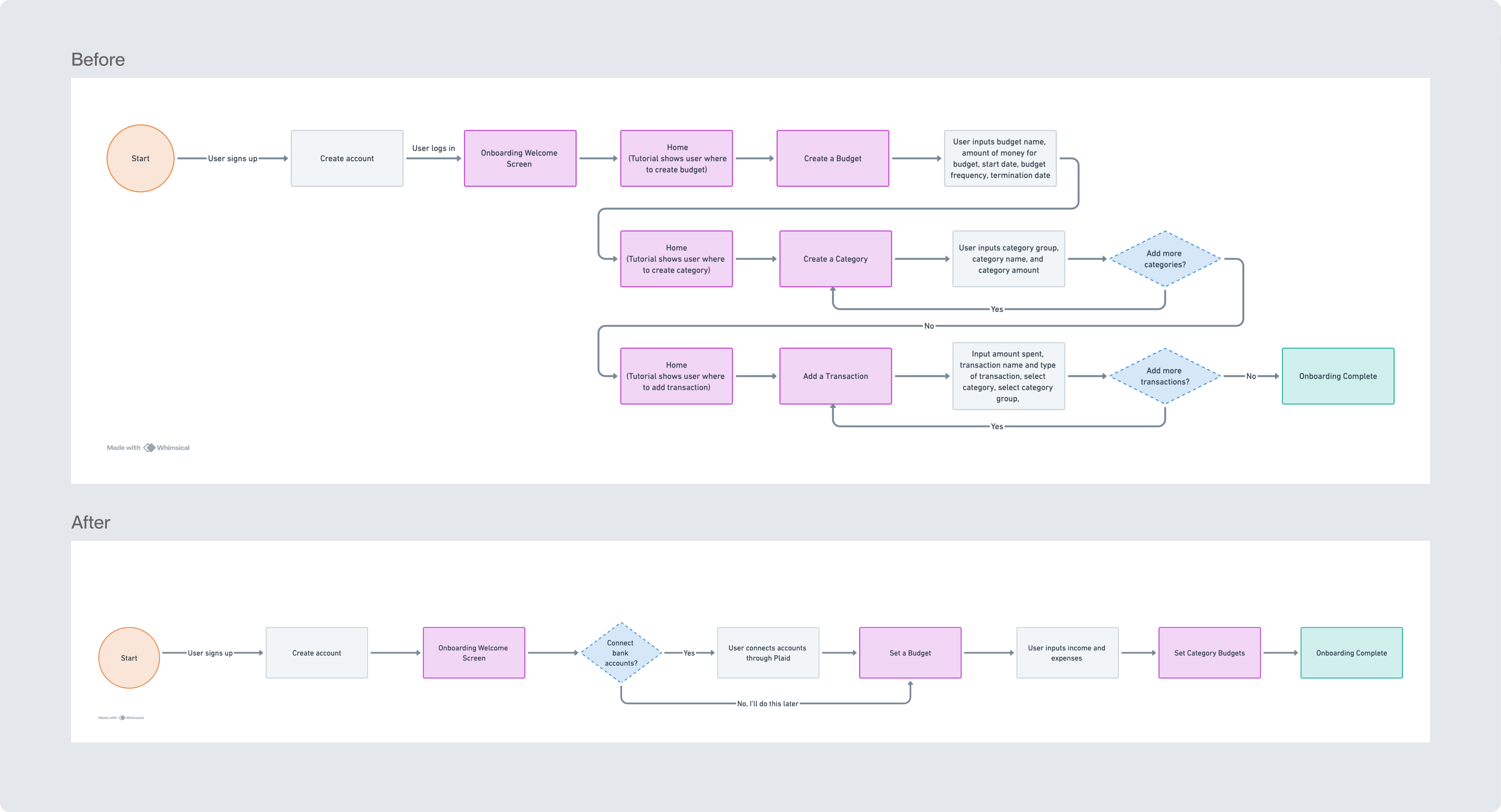 Taking insights from user research, I collaborated with the design team to map out comprehensive user flows illustrating the new user onboarding experience. We focused on redesigning the onboarding process to make it more intuitive and less labor-intensive. By breaking down complex tasks into manageable steps, we aimed to enhance user engagement from the very beginning.