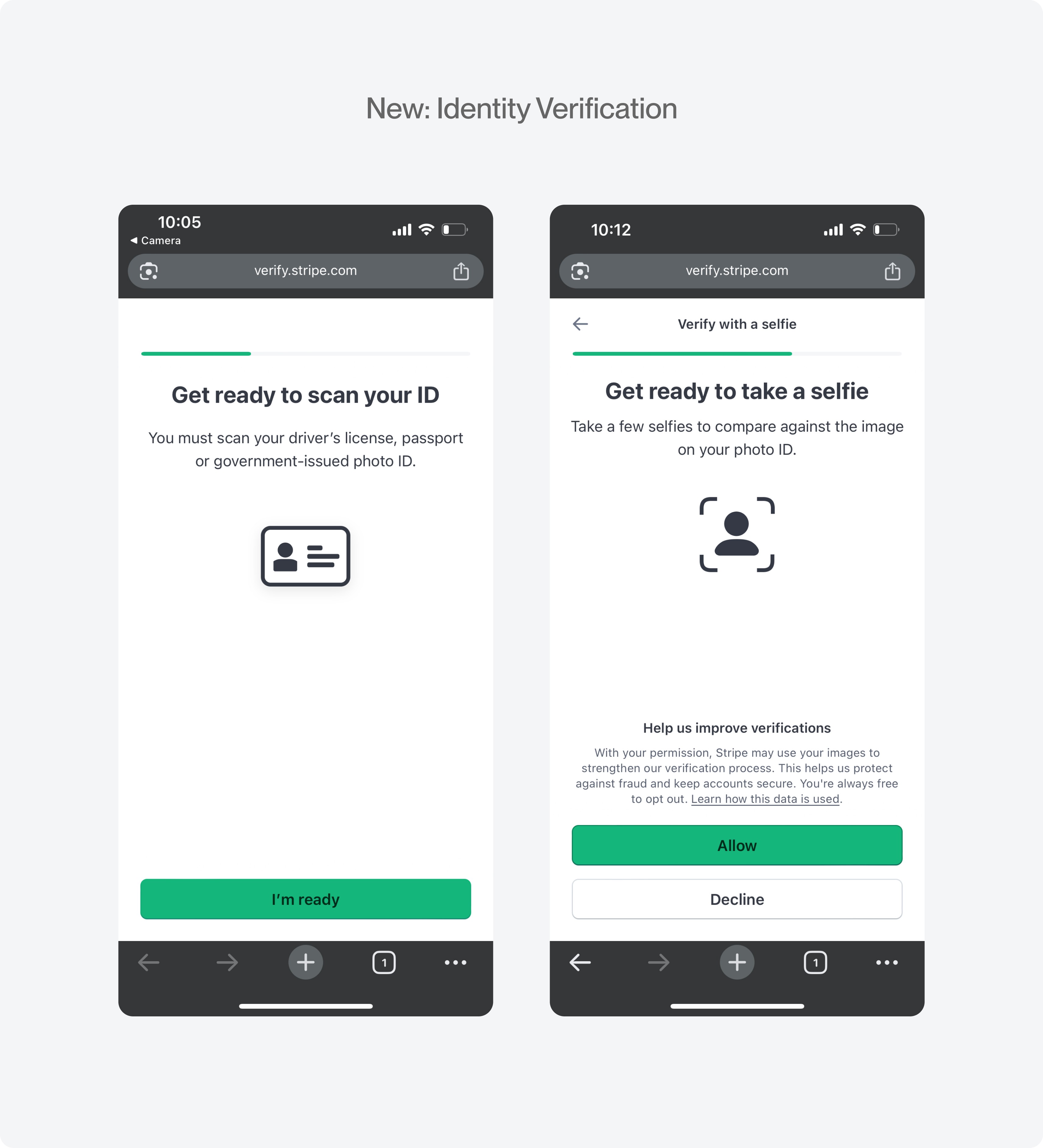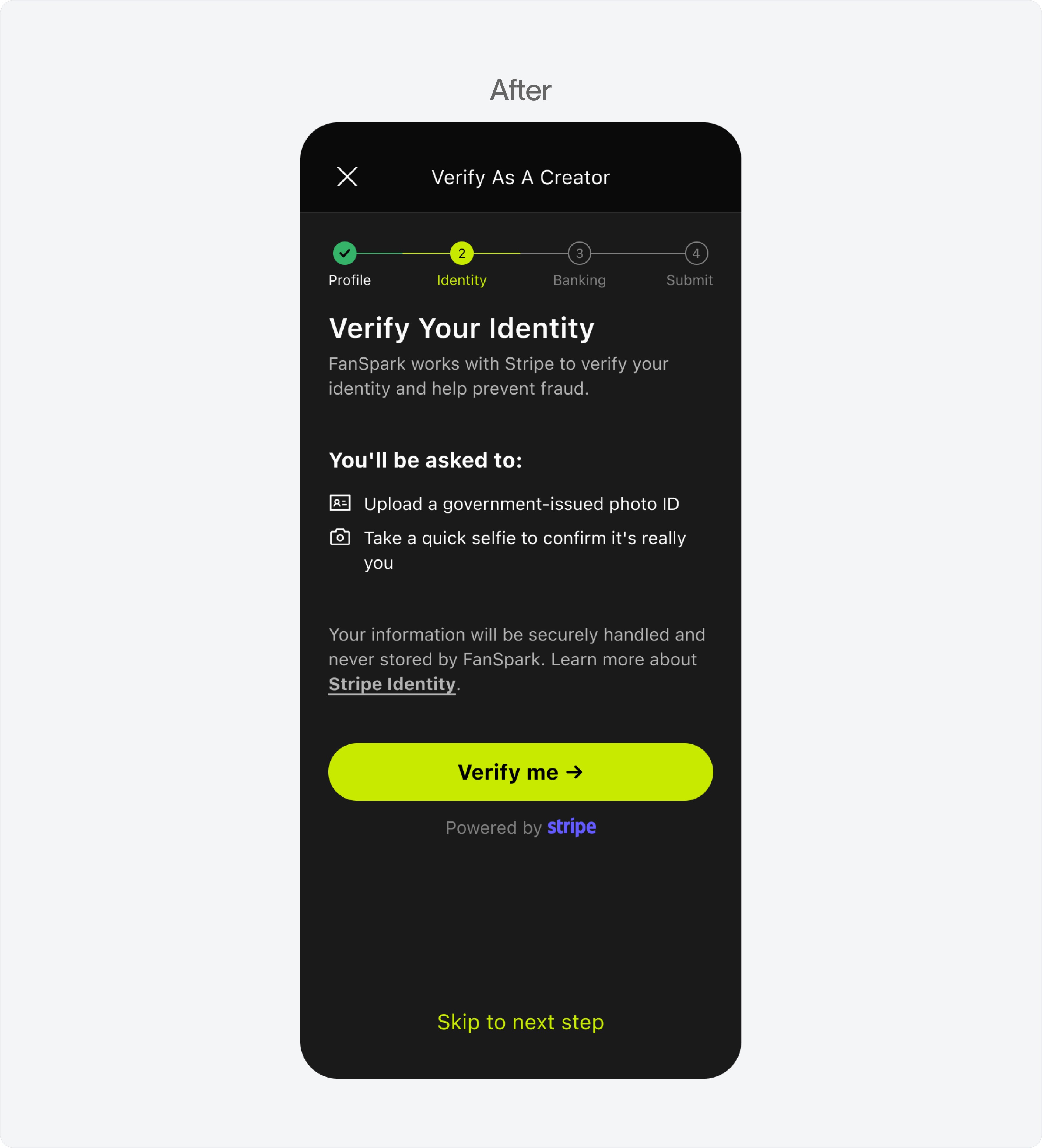 Technical: Stripe Identity integration dictated the verification UI and flow, limiting design changes to the entry point