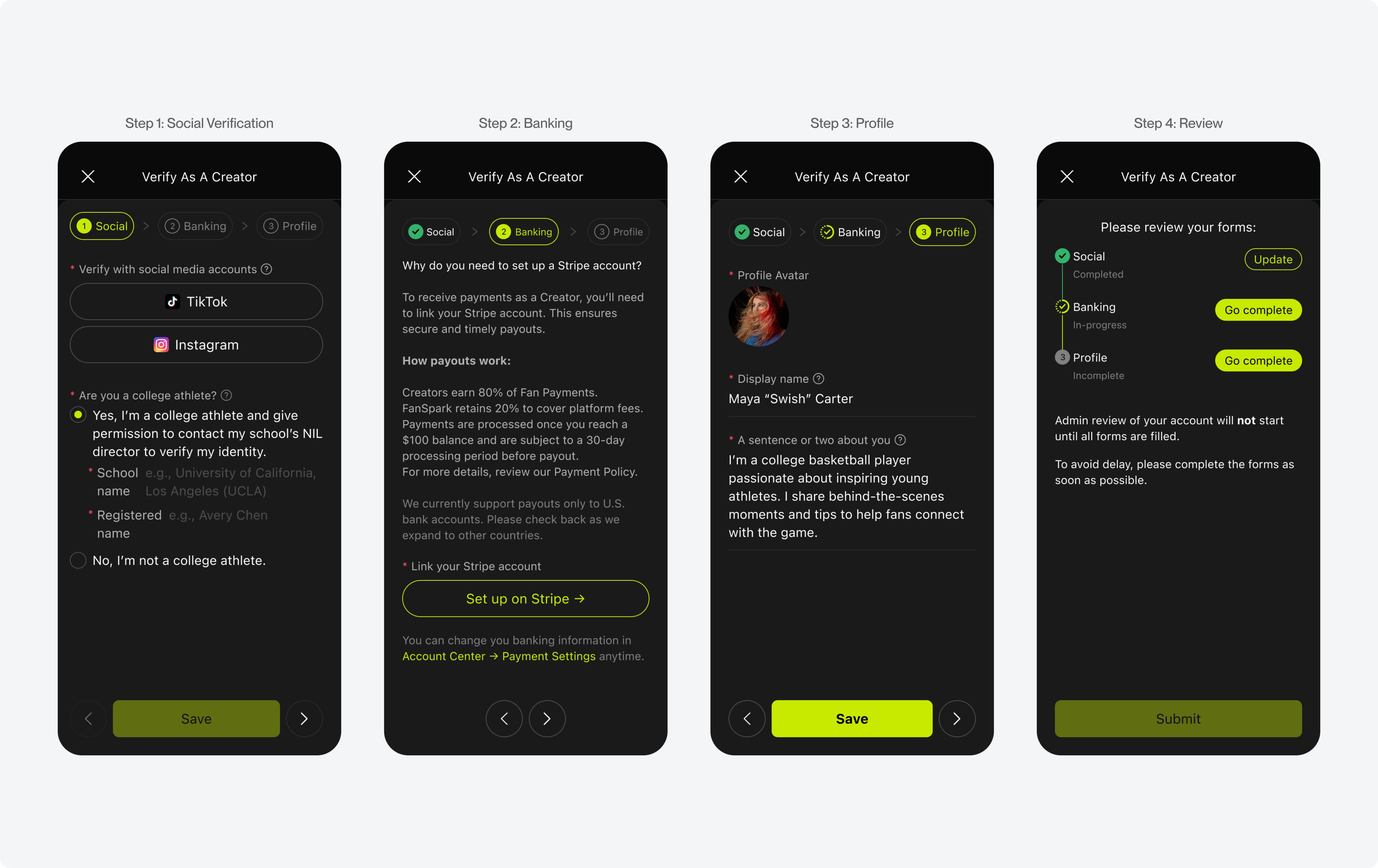 I defined a more flexible verification flow that allows creators to complete requirements progressively, reducing the upfront ask before they've experienced platform value. The updated flow is planned to be validated through A/B testing
