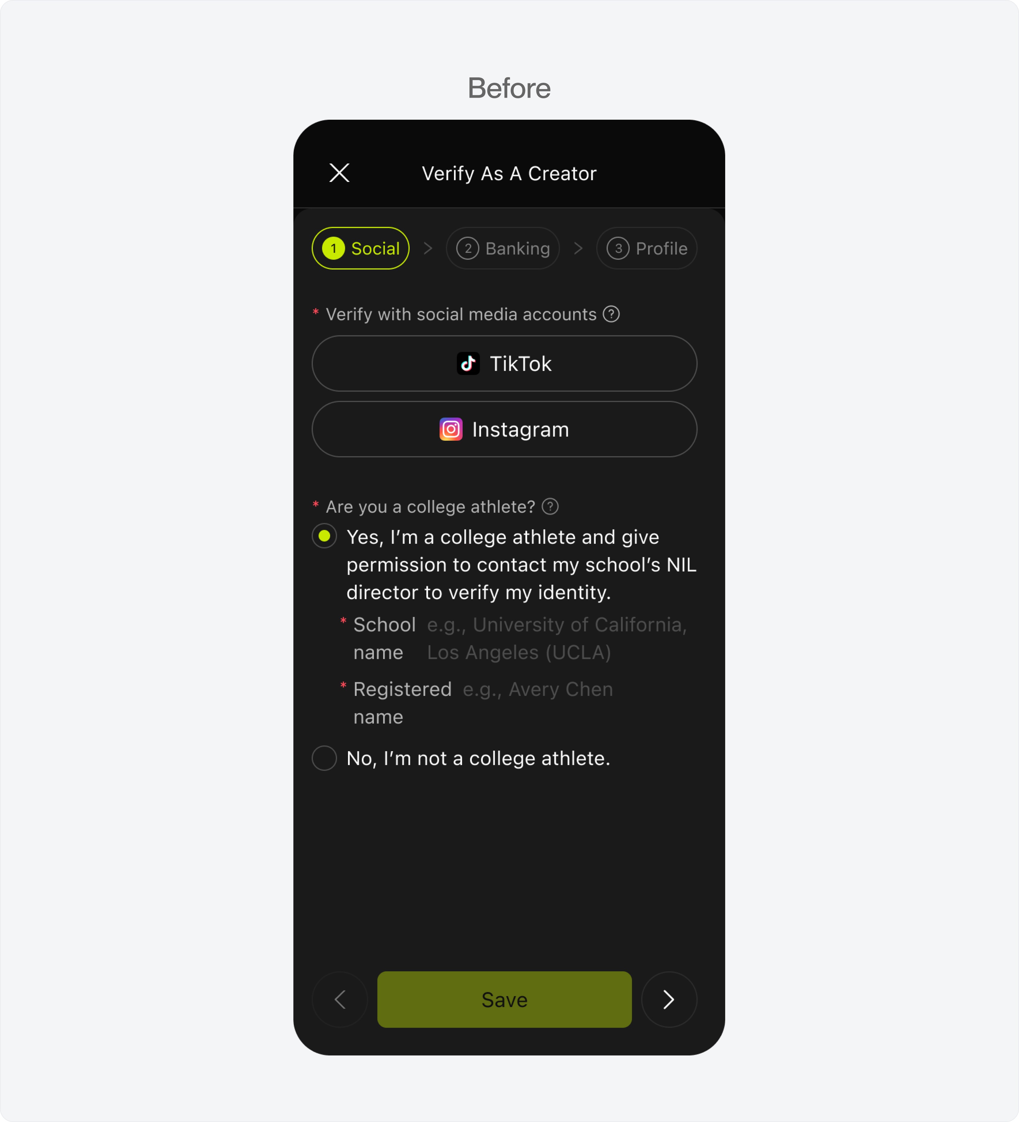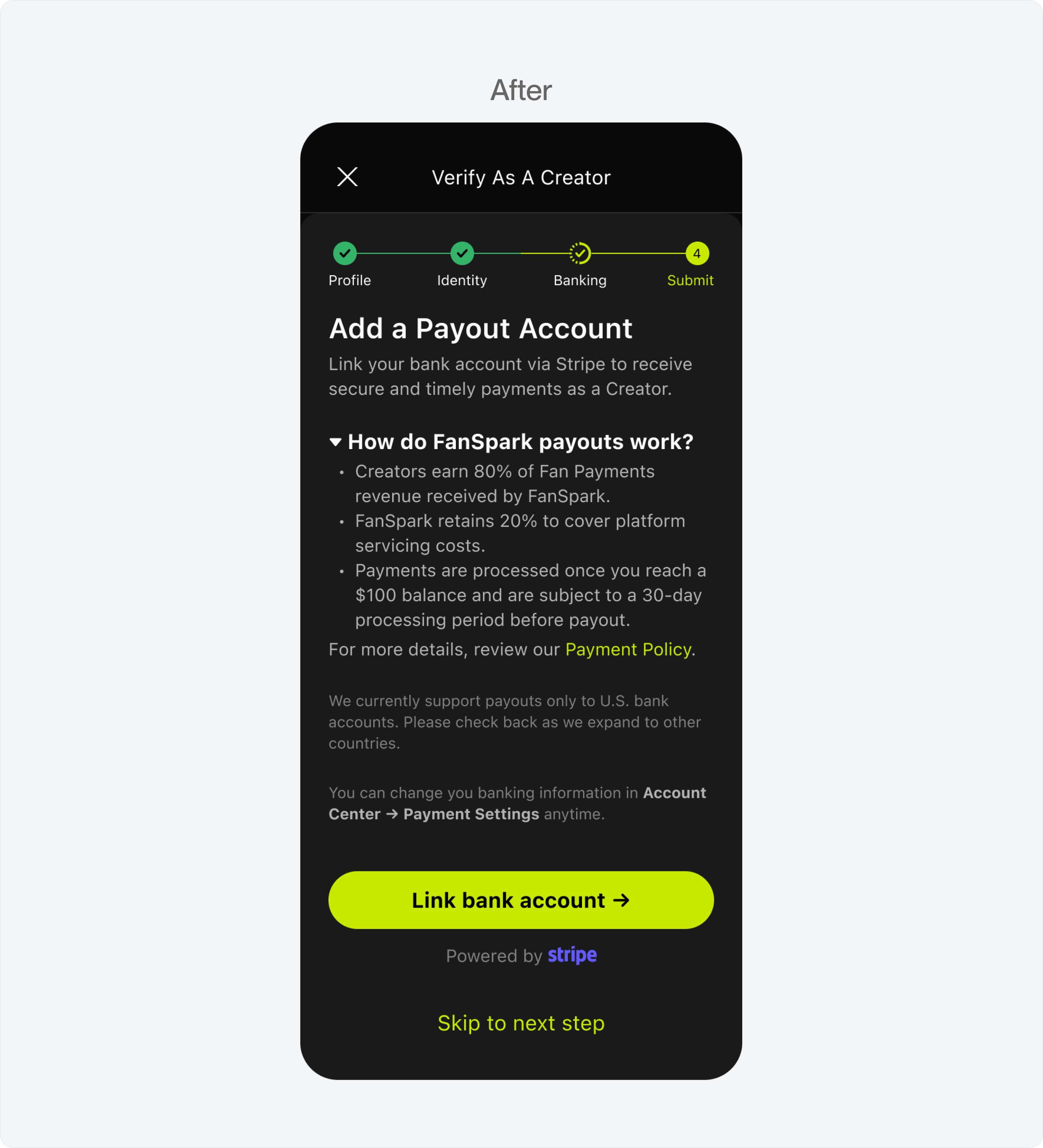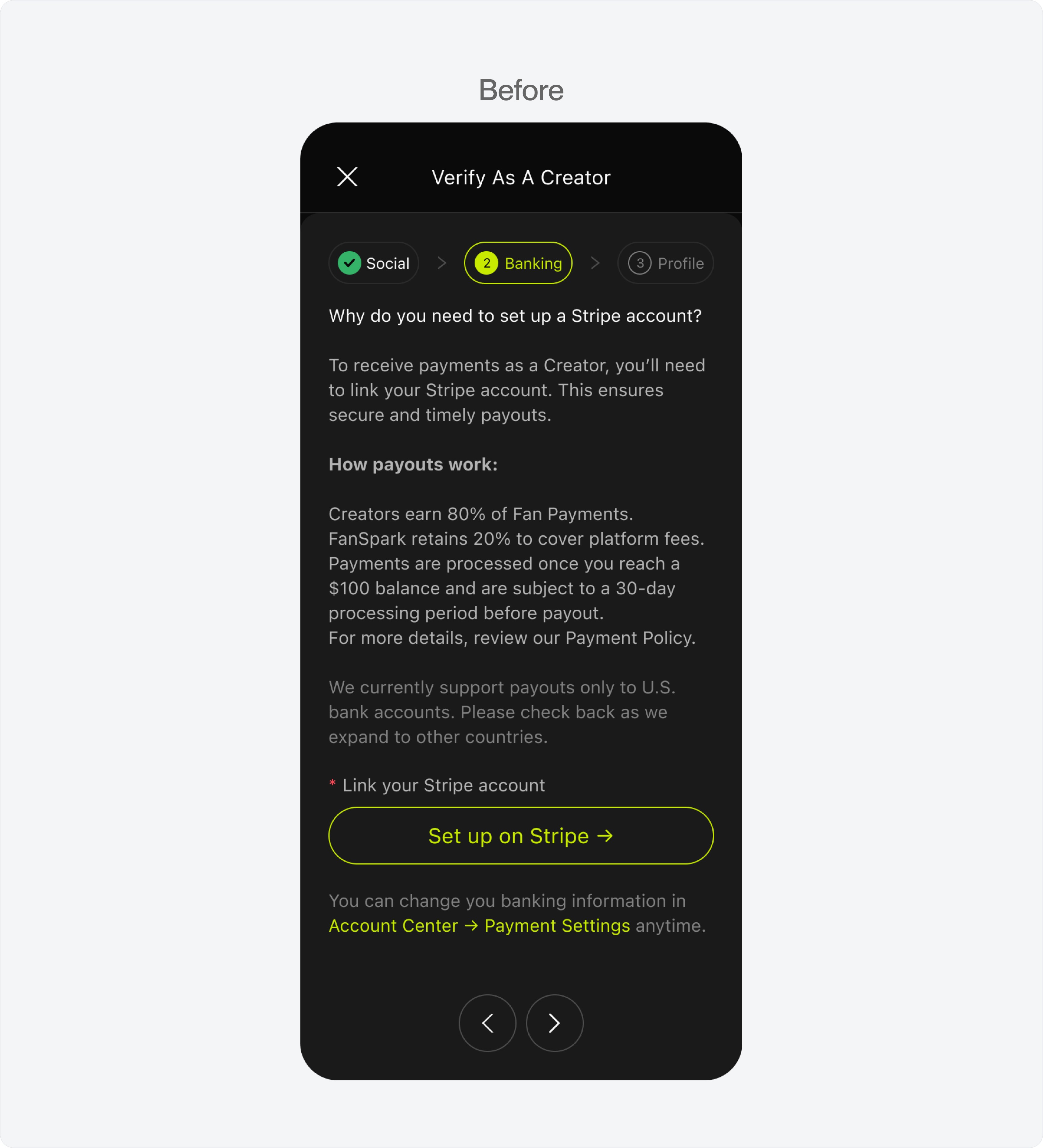 This timing plays a big role in the level of trust users have in the platform. Creators are brand new, trust is being formed, and now they're about to be asked for a higher level of sensitive information than social authentication.