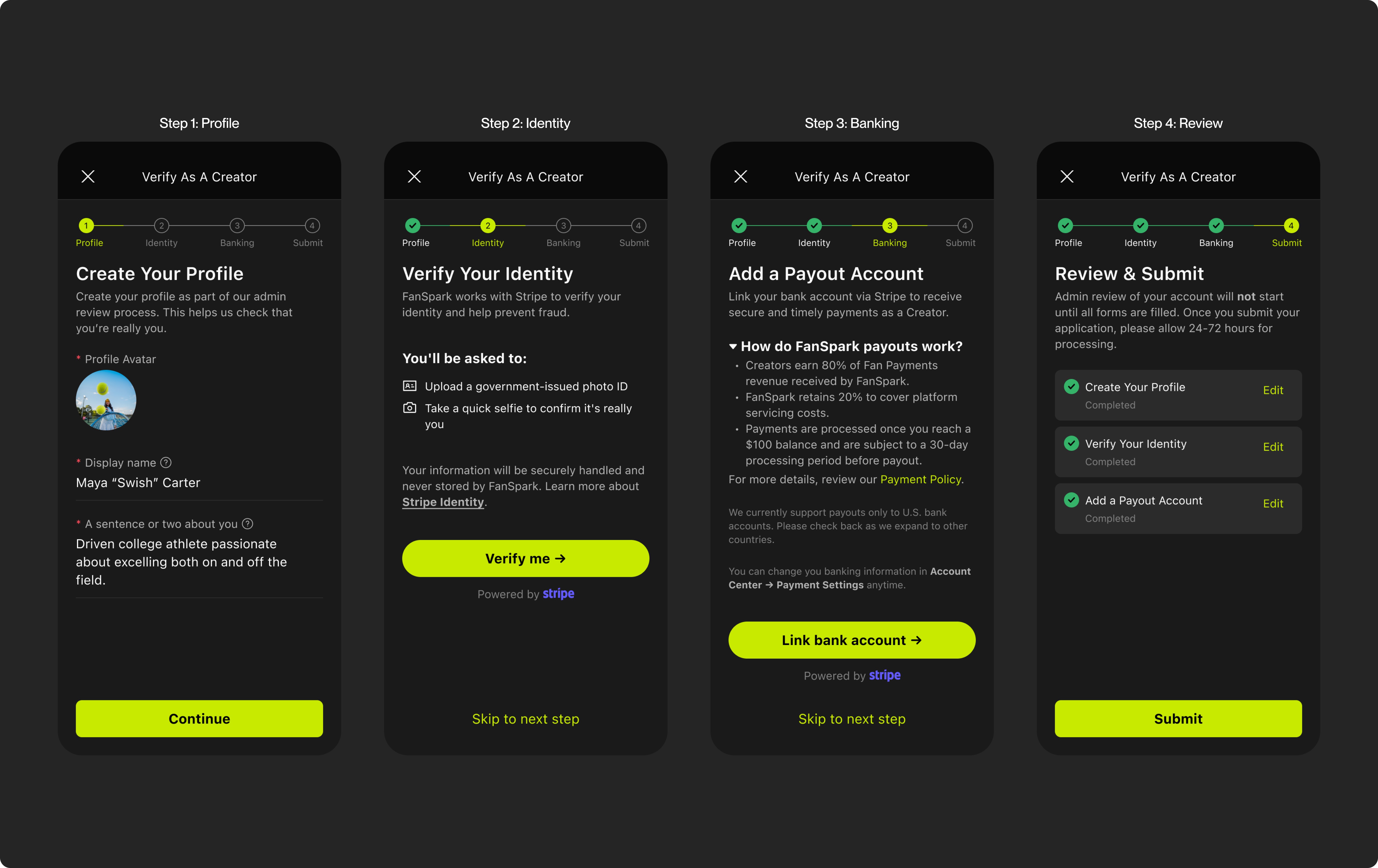 At this stage, creators would be cautious about sharing sensitive identity information, making drop-off the biggest risk leading to two design questions: